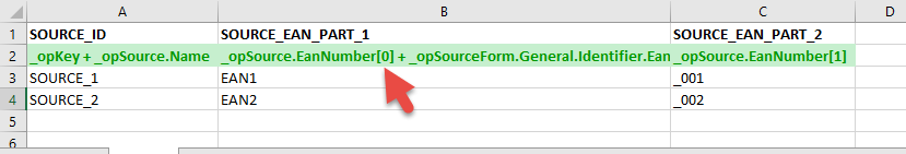 In this example, column SOURCE_EAN_PART_1 is mapped to the source form General.Identifier.Ean and also to the first part of the source property EanNumber