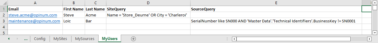 You can grant sites/sources by providing a custom query, which follows the same syntax as the one you can use in Insights. This is done by specifying a QUERY operation in the Mappings sheet and some custom queries in the users sheet.