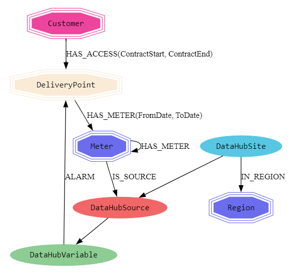- A Customer has access to some DeliveryPoint nodes for a given period of time through the relation HAS_ACCESS(ContractStart, ContractEnd)