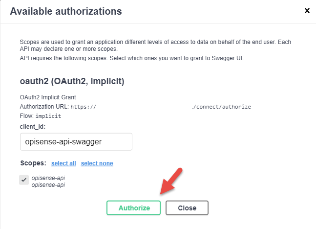Using client_id datahub-api-swagger and selecting datahub-api scope, click on Authorize button