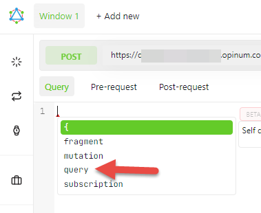 The query is now inserted, type '{'. The tool automatically inserts the closing '}'