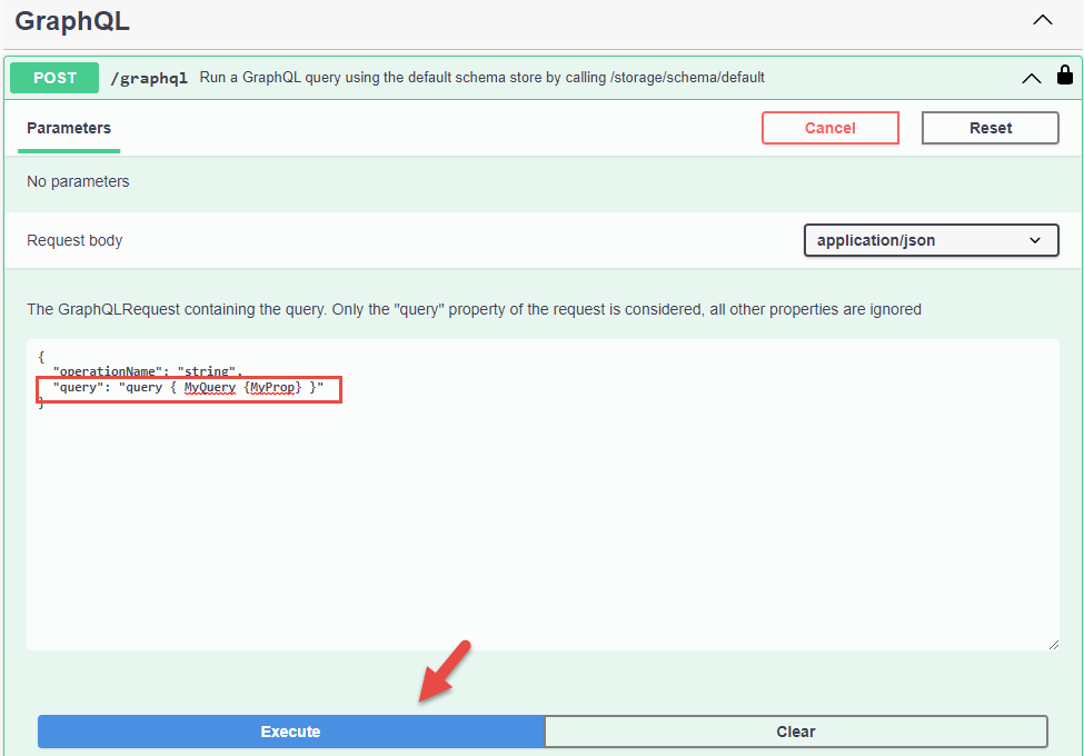 By calling /graphQL endpoint, which is the standard GraphQL endpoint. Replace the "query" value by the validated query query { MyQuery {MyProp} } and click on Execute