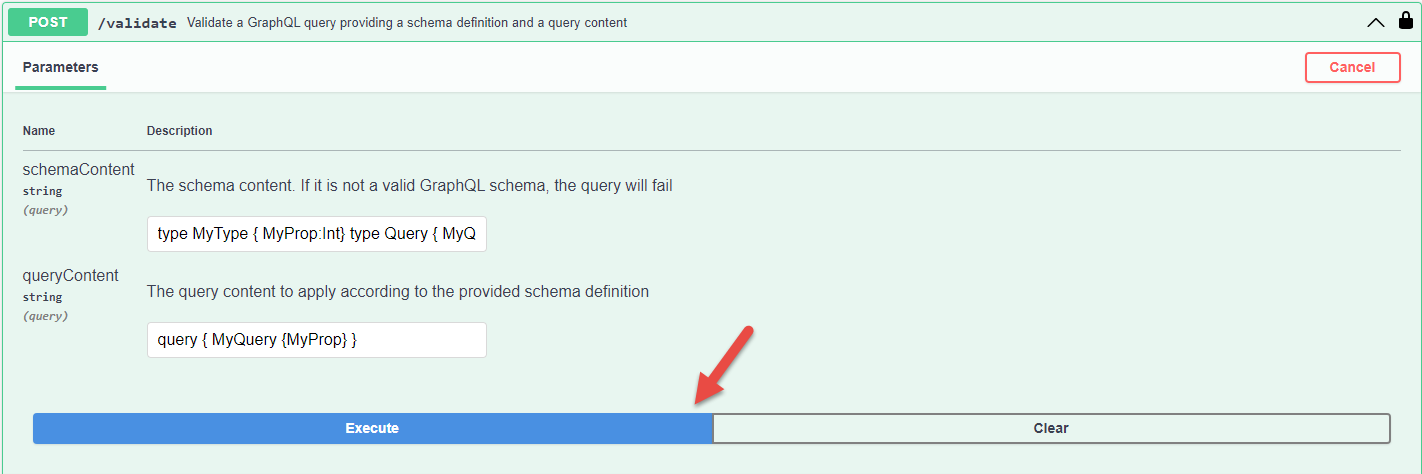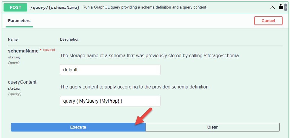 By Calling the /query/{schemaName} endpoint. Enter 'default' in the schemaName field, the validated query query { MyQuery {MyProp} } in the queryContent field and click on Execute button