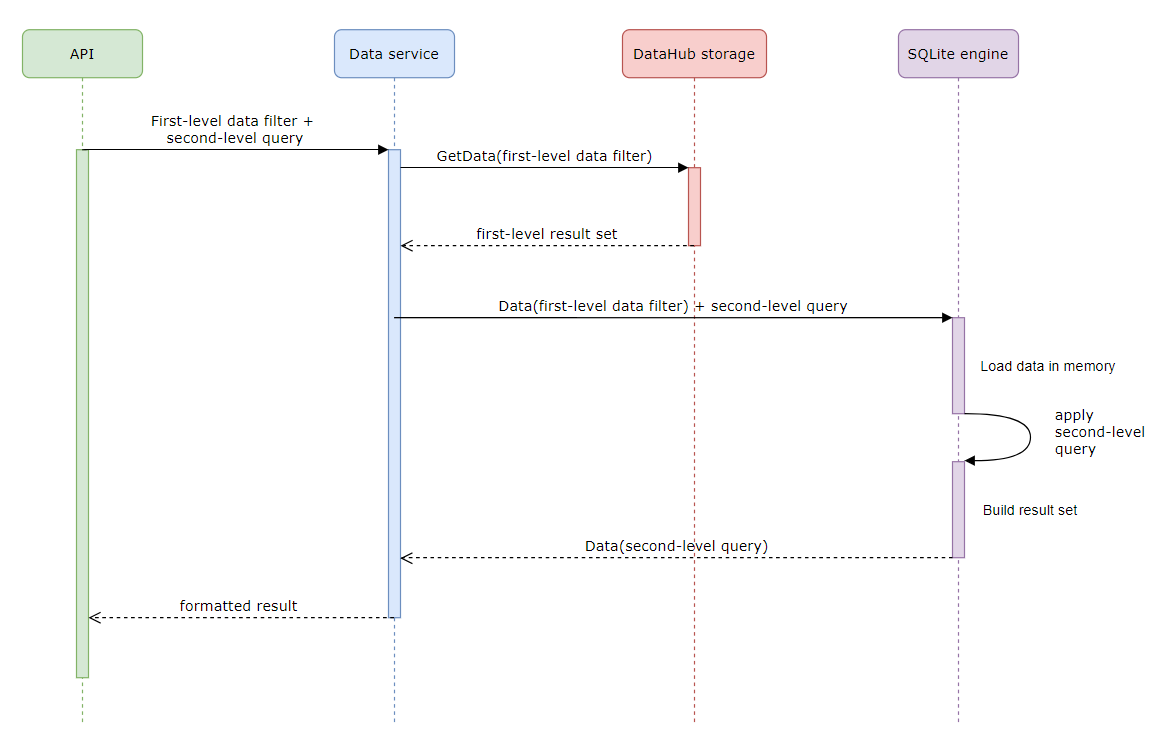 The first-level data set is formed by applying the first-level data filter on Insights data storage. This first-level data set is then stored in a SQLite in-memory engine that will apply the second-level Sum values by variable Id query to produce the second-level data set which is the expected result.